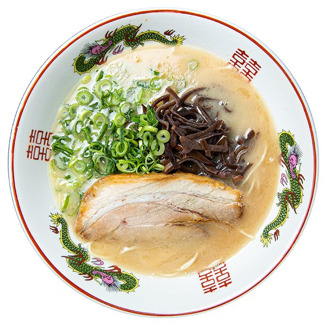 歴代大将に挑戦の意味を込めて唯一無二のどろスープに手を加え出来上がった究極の『どろどろラーメン』。国産げんこつのみを専用の圧力鍋で10時間以上炊き上げ骨のエキスを抽出した高濃度の乳化スープ。北九州のヤマニ醤油の吟醸薄口醤油に自家製チャーシューのタレを混ぜた甘めのかえし。