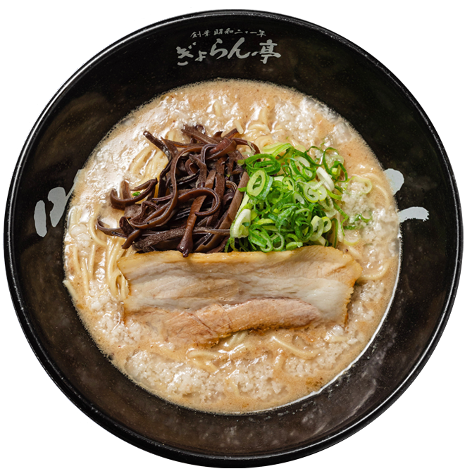 「ぎょらん亭」の原点である「十割ラーメン」は、通常の倍量の国産げんこつを長時間炊きあげてつくるド豚骨ラーメン。朝一番のフレッシュなスープを一定の濃度で濾さずに炊き続け、丼に注ぎながら濾すことで軟骨や脂身の旨味を余すことなく抽出。北九州ヤマニ醤油の吟醸薄口をベースにした「かえし」を合わせることで、旨味・濃度・塩分が調和したメリハリのある味わいを生み出します。とろりと濃厚なのに、くさみやざらつきのないスープは、丼の底まで飽きない旨さ。麺は中太か細麺から選べる喉越しのいいストレートです。甘辛いタレで煮込んだ名物の厚切り1枚チャーシューと共に、唯一無二の味をご堪能ください