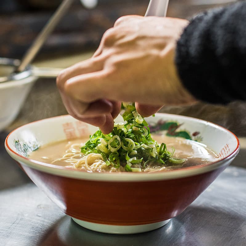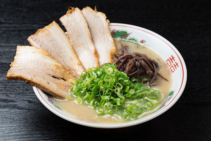 国産げんこつを圧力鍋で10時間以上炊きあげ、骨のエキスのみを乳化させて抽出した高濃度の豚骨スープ。合わせる「かえし」は北九州ヤマ二醤油の濃口をベースに、チャーシューのタレを加えた「甘め」が特徴。丼に注ぐ直前にミキシングすることで、クリーミーでまろやかな口当たりの「泡系スープ」が完成します。独自ブレンドの粉でつくる中太の硬麺は、とろみのあるスープとベストマッチ。丼を彩る厚切り1枚チャーシューも食べ応え十分です。トッピングの背脂を溶かしつつ味わうと、さらなるスープの奥行きが。百聞は一見にしかず。