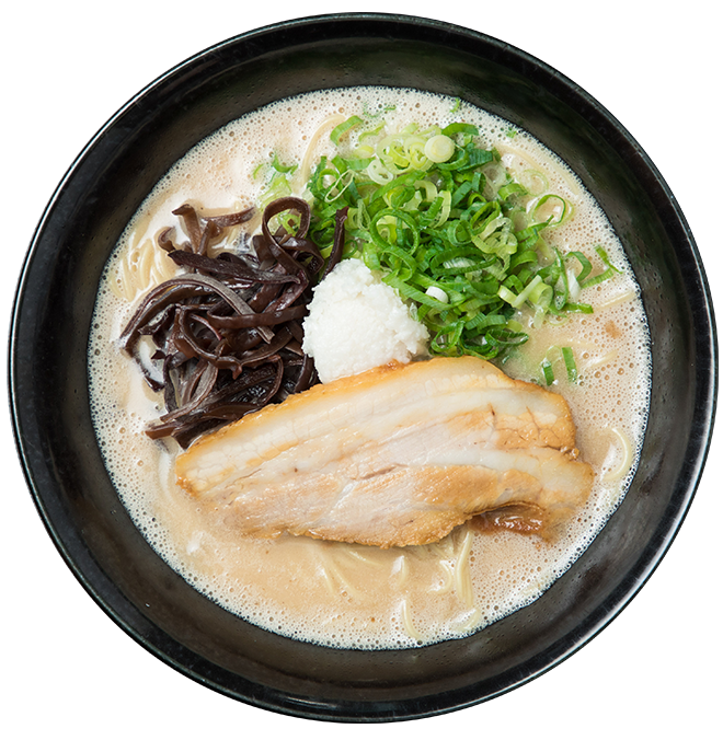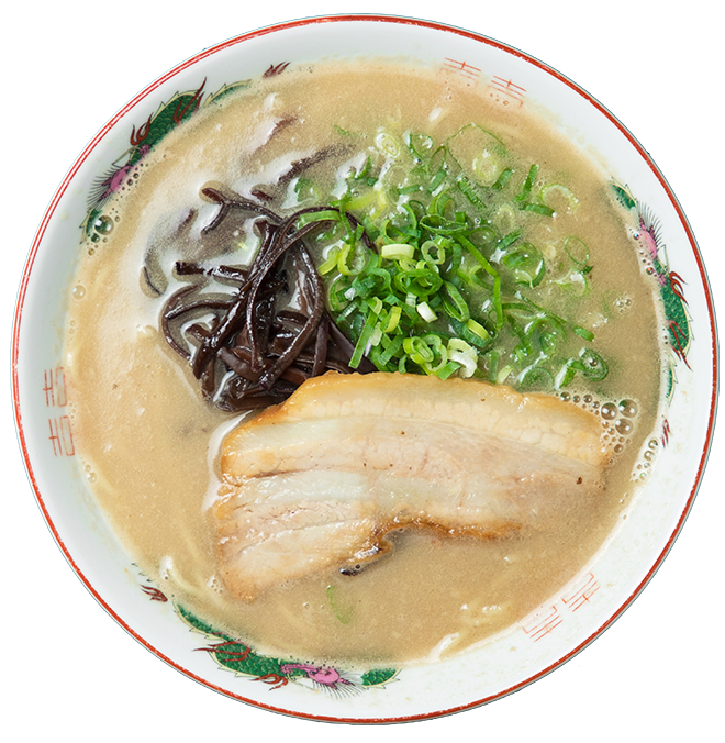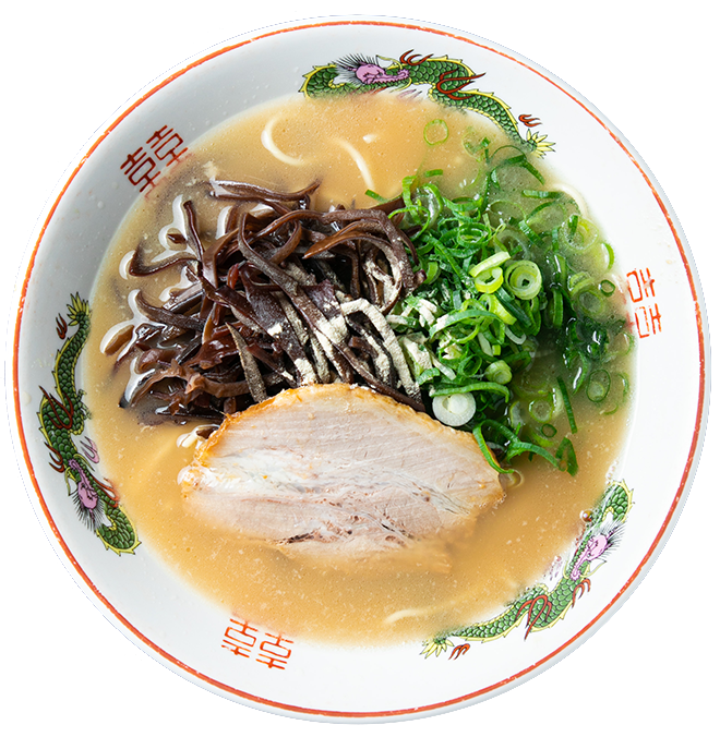歴代大将に挑戦の意味を込めて唯一無二のどろスープに手を加え出来上がった究極の『どろどろラーメン』。国産げんこつのみを専用の圧力鍋で10時間以上炊き上げ骨のエキスを抽出した高濃度の乳化スープ。北九州のヤマニ醤油の吟醸薄口醤油に自家製チャーシューのタレを混ぜた甘めのかえし。